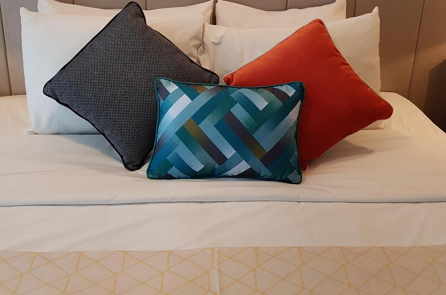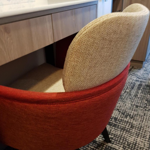 The TUI and Marella team wanted to upscale the interiors onboard, executing a brand new look for cabins , in the brand colours of blue, orange and cream, with new bedding, cushions and curtains part of the complete make-over. Fabrics for the bed-throws included bespoke printed designs, geometrics, textures and plain velvets. New furniture, vanity and side chairs, in the cabins were upholstered in a range of Skopos' soil resistant fabrics, with curtains in a neutral colourway